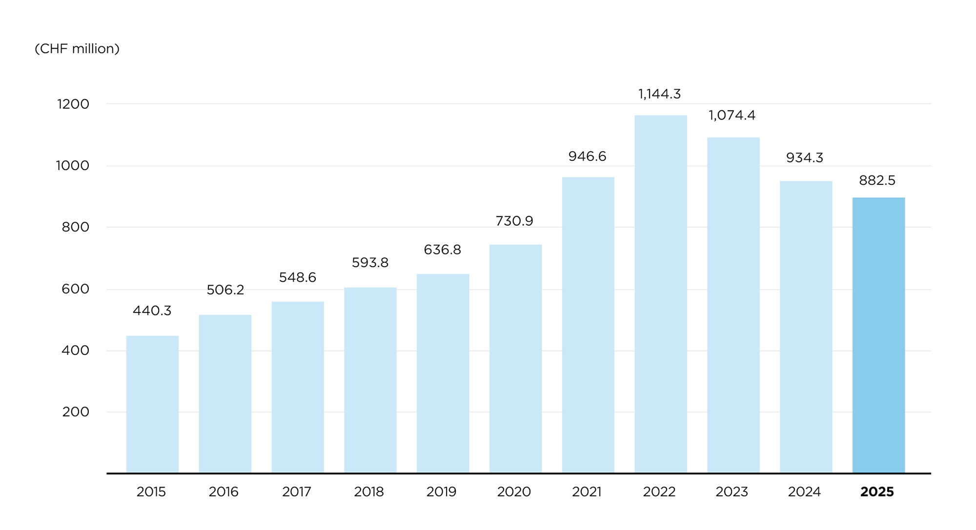 Gross profit reached CHF 310.8 million (2024: CHF 320.6 million), which was CHF 9.8 million or 3.0% below the prior-year figure. The gross profit margin increased to 35.2% of sales (2024: 34.3%), despite a negative impact from tariffs.