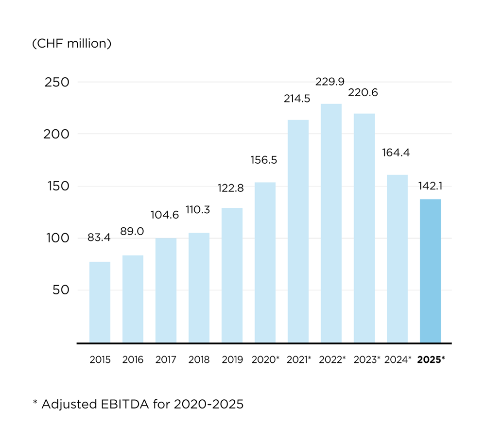 Reported EBIT in the Partnering Business amounted to a loss of CHF 103.6 million (2024: profit of CHF 46.6 million), primarily due to the non-cash impairment charge of CHF 139.5 million from the strategic restructuring of less profitable or loss-making product lines. Adjusted EBITDA3 for the segment was CHF 89.7 million (2024: CHF 91.1 million), reflecting an adjusted EBITDA margin of 17.7% of sales (2024: 16.9%). The adjusted EBITDA margin increased, mainly due to a positive product mix and strong cost control, which outweighed the adverse effects of foreign exchange and tariffs.