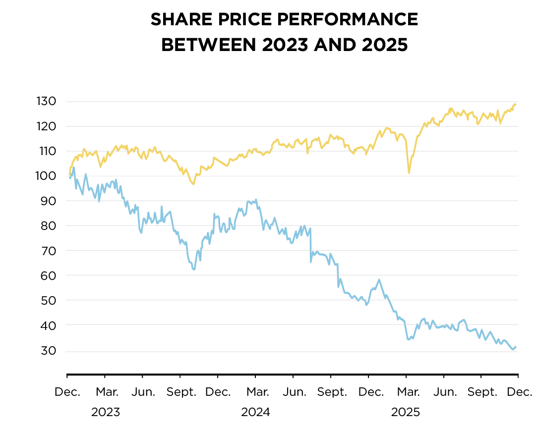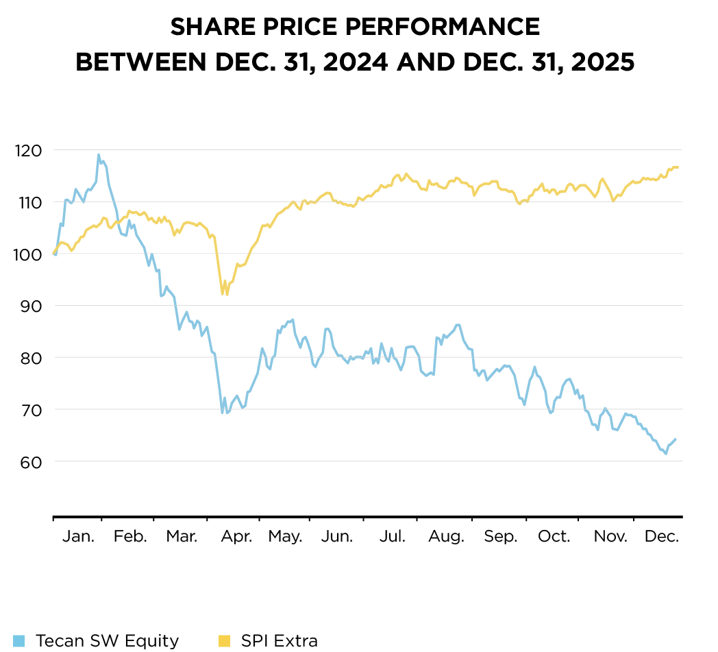 In 2025, the Tecan share declined by 36.6%, closing the year at CHF 128.50. The year was challenging for the life sciences industry overall, which continued to face uncertainty on multiple fronts. Ongoing policy noise, including NIH funding uncertainties in the US and potential tariffs for pharmaceutical companies, contributed to more restrictive CAPEX investments in instruments. In addition, persistent market weakness in China weighed on sector performance. As a result, the life science tools sector underperformed the broader market for the fourth consecutive year.