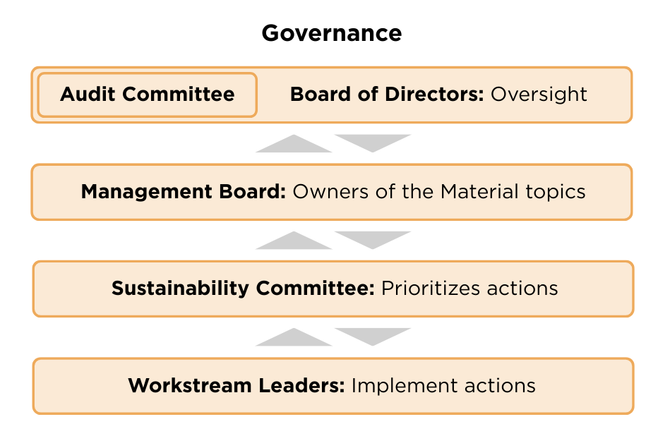 Tecan’s Audit Committee of the Board of Directors has responsibility for the oversight of sustainability topics, and delegates management of these to Tecan’s Management Board. Tecan’s CFO or Global Head, Sustainability update the Audit Committee members on key topics at least twice per year, and Tecan’s Global Head, Sustainability briefs the full Board of Directors during the annual strategy deep dive. Board members may also be briefed on sustainability developments by the CEO and respective Management Board members during their regular meetings, as described in the more detailed overview of our Board in the Corporate Governance section of Tecan’s Annual Report. Board of Directors members have relevant sustainability expertise, gained in their previous roles as CEOs or senior executives of companies with sustainability programs. A well-rounded understanding of business impacts is one of many criteria looked for in potential Board members; the opportunity to increase the visible diversity of Tecan’s Board of Directors is also one of the many factors considered, as is maintaining the gender balance of the Board. Further detail about how Tecan’s Board of Directors functions is set out in the Corporate Governance Report chapter of the Annual Report, as well as in Tecan’s Organizational Regulations.