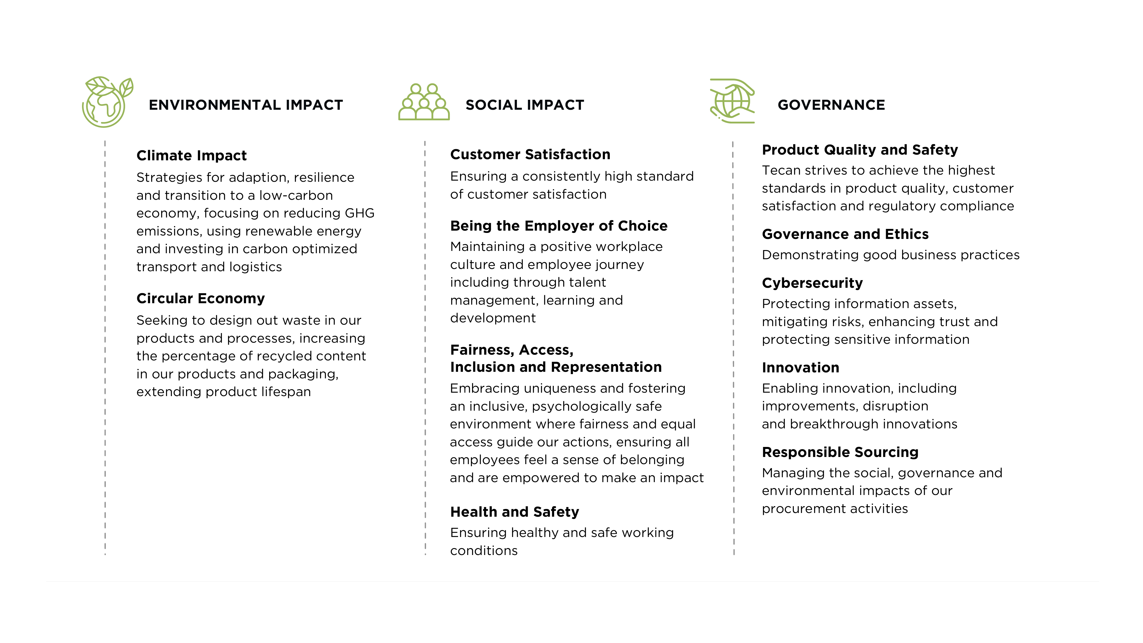 At Tecan we improve people’s lives and health by empowering our customers to scale healthcare innovation globally from research to the clinic. We collaborate with our customers in healthcare and the life sciences, from early-stage innovation through delivery of clinical solutions. We deliver the products, services and solutions that make lab processes and medical procedures precise, reproducible and compliant. This leads to scalable outcomes that are further reaching and ever more valuable to humankind. Tecan’s sustainability strategy supports the Company’s purpose, is integrated into Tecan’s annual strategy development and review process and was approved by the Board of Directors in 2023. This strategy enables Tecan to say, “Our products add value to society, our business practices do, too.” Both a description of how Tecan operates today and an aspiration indicating the areas in which Tecan will strengthen processes on an ongoing basis, the strategy states: From design through production to end-of-life, we maximize the positive impact of our products and business practices. Tecan’s products enable innovative healthcare, consider ecodesign, and are produced with responsibly sourced materials. Our sites are carefully managed to minimize negative environmental impacts and to implement practices which have a positive environmental impact. We consistently demonstrate excellence in product quality and safety, governance, and risk management, and have a measurable positive impact as an employer and in our communities. Implementation of this strategy is further described in the Environment, Social Impact, and Governance sections of this Sustainability Report.